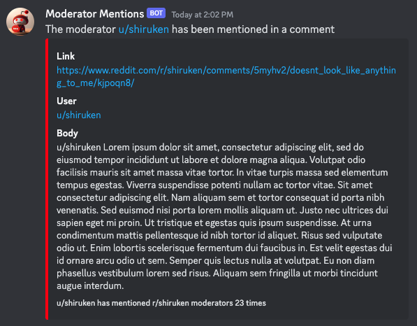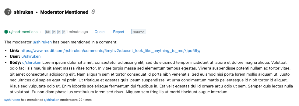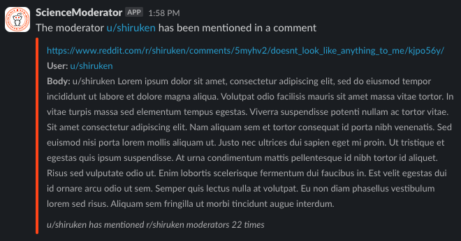 Get notified about moderator username mentions in your subreddit and (optionally) action the content. Supports Modmail, Slack, and Discord. Generate reports to easily identify the top offenders.