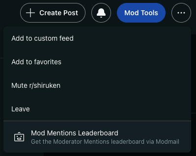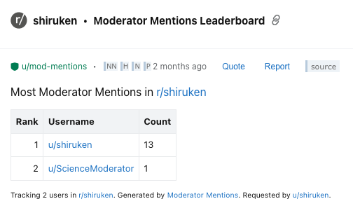 This action appears under the moderator menu for the subreddit. It generates a leaderboard listing the users that have mentioned the most moderators.