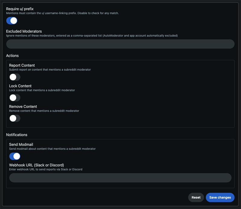 - Actions: Moderator actions (report, lock, and remove) to take on content that mentions a subreddit moderator